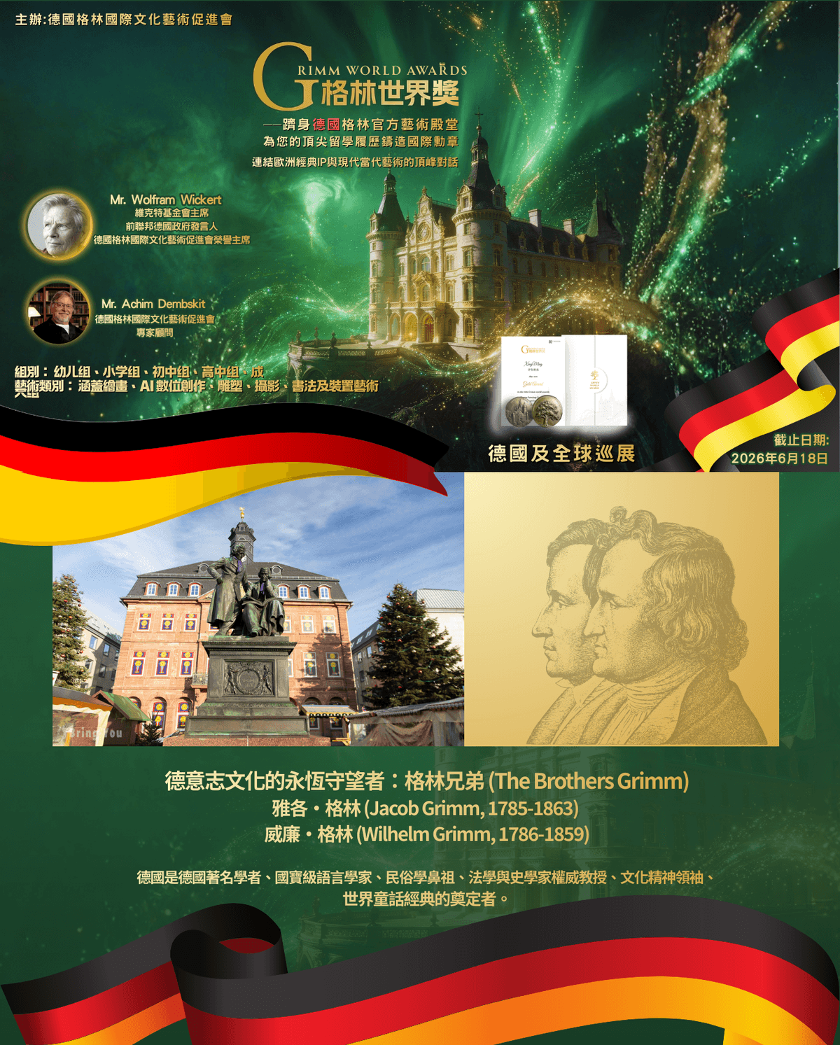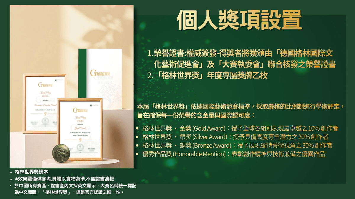 「格林世界獎」由 德國格林國際文化藝術促進會 主辦,旨在致敬聯合國「世界記憶名錄」遺產——《格林童話》。本賽事不僅是一場視覺藝術的競技,更是一場跨越時空的當代對話。我們鼓勵全球藝術家以「Nature · 自然」為原點,運用現代創作語言解構經典 IP,為國際藝術履歷增添具備政商學界認可的高含金量賽事。