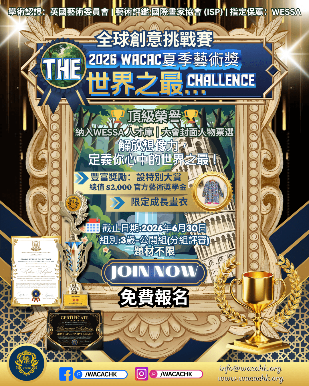 • 小學組及以上特別大賞得主(共 4-5 名): 獲頒 $400 港元 WACAC 官方藝術電子獎學金。(可全額抵扣未來任何 WACAC 國際賽事報名費)