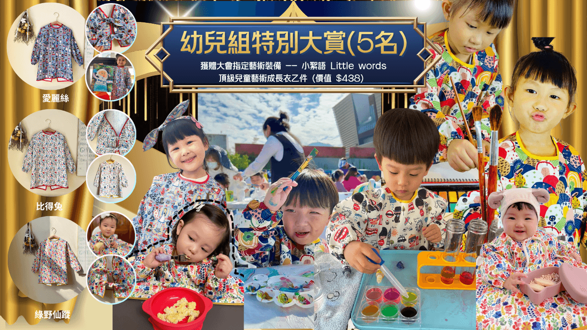 • 幼兒組特別大賞得主(共4-5 名): 獨家獲贈大會指定藝術裝備 ——「小絮語 Little Words」頂級兒童藝術成長衣乙件(價值 $438)。(為天才小畫家專屬打造,讓創意盡情揮灑!)