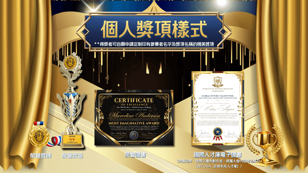凡榮獲金獎、銀獎得主,於下方申請任一「獎項配置」時,大會將自動為您豁免國際註冊費(HKD180),並同步獲發【WESSA 全球未來人才庫 Induction(入選)官方電子證書】,為您的國際學術履歷強力背書!